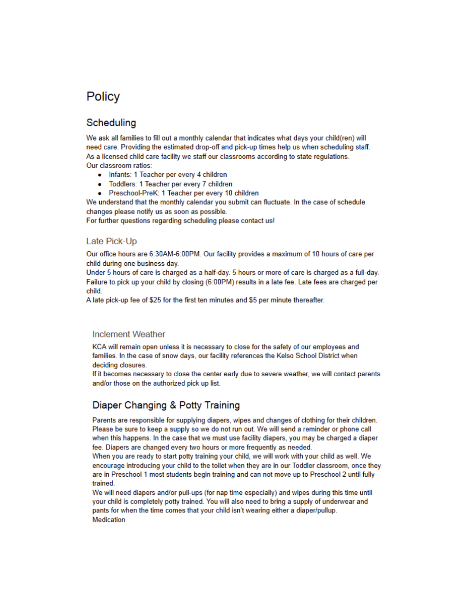 Our Policies are designed to create a safe, consistent, and Christ-centered environment for every child at Kelso Christian Academy. These guidelines outline important expectations for families and staff, including daily routines, communication procedures, safety standards, attendance practices, and general school operations. By reviewing and agreeing to these policies, parents partner with us to ensure that our classrooms run smoothly and that each student can thrive in a structured, nurturing setting. We encourage families to read through our policies carefully, as they reflect our commitment to excellence, integrity, and the well-being of every child entrusted to our care.