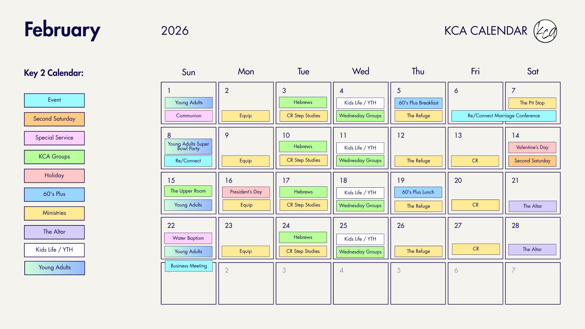 There’s always something going on at KCA, and we don’t want you to miss a thing. From Sunday services and small groups to special events, classes, and family activities—our church calendar keeps it all in one place. Whether you’re planning your week or looking for your next step, the KCA calendar is your go-to hub for what’s coming up. Check it often, get involved, and jump in with what God is doing in our church family!