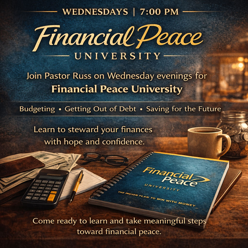 Join Pastor Russ on Wednesday evenings at 7:00pm for Financial Peace University, a practical class designed to help you gain confidence and clarity with your finances.
