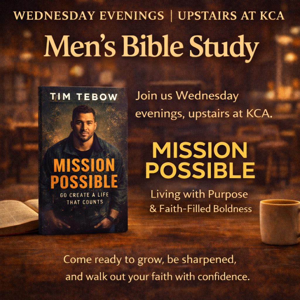 Join us on Wednesday evenings, upstairs at KCA, for our Men’s Bible Study as we dive into the study Mission Possible together.