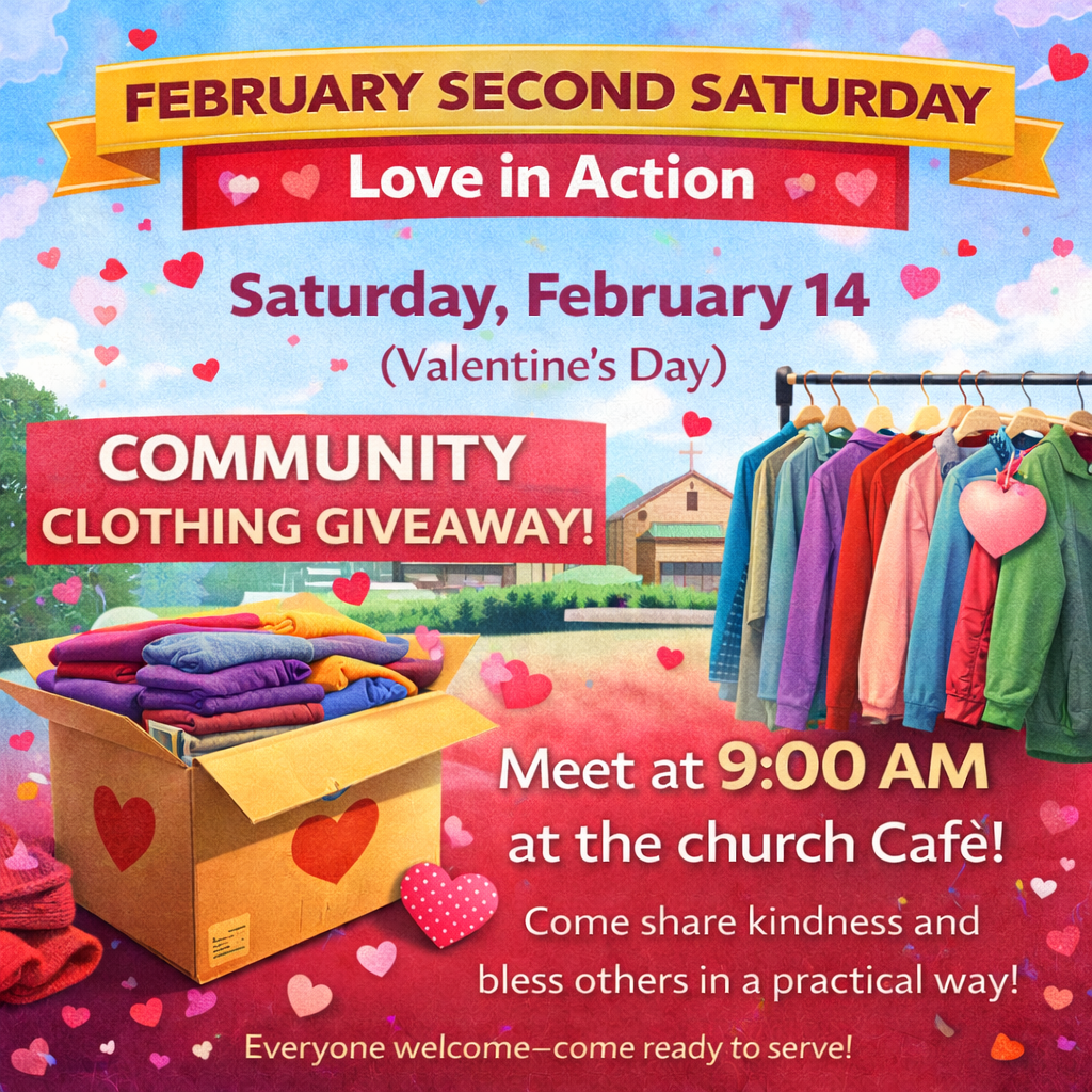 This Second Saturday, Saturday, February 14 (Valentine’s Day), we’re celebrating love in the best way possible—by serving our community through a Community Clothing Giveaway right here at the church.